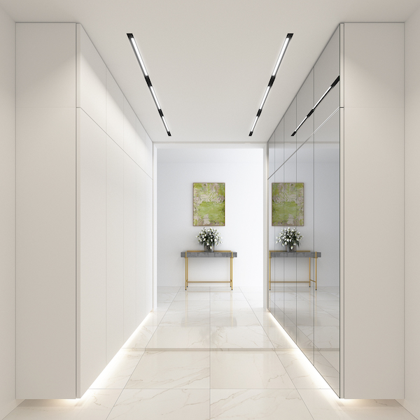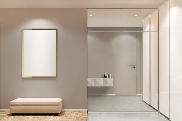 玄関の姿見として使えるよう、ミラー仕様(1列もしくは全面)の扉を選択可能。小物を飾るカウンターや天袋を設けるレイアウトにも対応し、設置スタイルは床置きと壁付けのフロートスタイルから選べる。