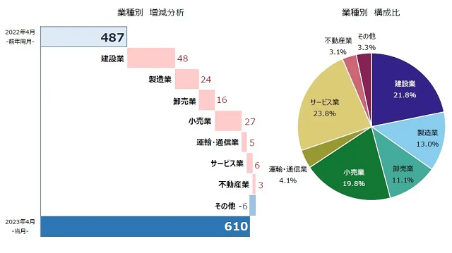 業種別でみると、全業種で前年同月比を上回った。「建設業」は前年同月比56.5%増(48件増)の133件で、「サービス業」145件(4.3%増)に次ぐ多さ。建設業では資材価格高騰や人手不足が続いており、特に「職別工事」(58件、70.6%増)で増加が目立つ。