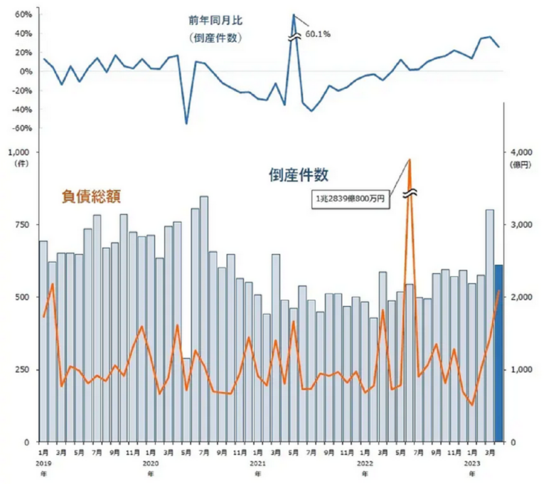 帝国データバンク(東京都新宿区)は5月11日、4月の企業倒産件数(負債1000万円以上の法的整理が対象)について集計・分析した結果を発表した。倒産件数は、前年同月比25.3%増の610件となり、12カ月連続で前年同月を上…