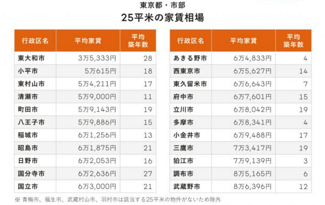 もっとも賃料が安かったのは東大和市の3万5333円だった。もっとも賃料が高かったのは武蔵野市の8万6396円で、23区内とほぼ変わらない水準の市部もあるが、基本的には7万円以内で収まる物件が多い傾向にあった。