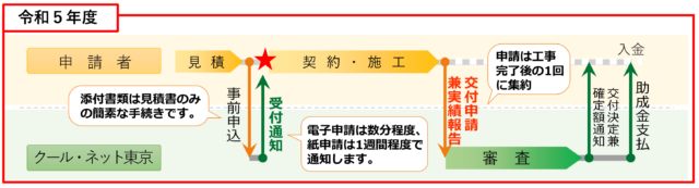 手続き方法は、まず簡易な事前申し込みを行う。添付書類は見積書のみ。申し込みを電子申請で行った場合は数分後、紙申請で行った場合は1週間程度で、クール・ネット東京から受け付け完了の連絡がある。契約・施工は事前申し込み受付後に行う。施工完了後に実績報告を行い、審査に通れば助成金が支払われる。