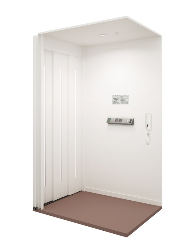 設置間口は従来より125ミリ縮小した業界最小の1220ミリで、自走式車いすに対応。有効率を5.6%向上し、3人乗りサイズのエレベーターを設置することもできる。また、リフォーム時の工期を約3日削減することに成功した。