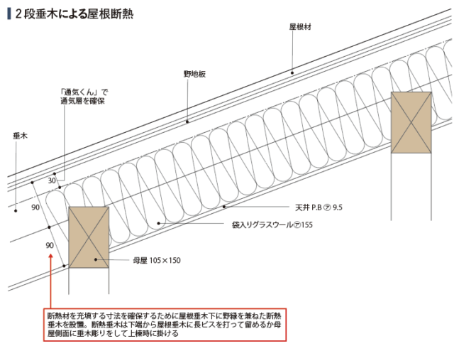 ➡現状は45×90㎜の垂木を2段重ねするほうが安価。下段の垂木は傾斜天井の野縁を兼ねるのも好都合