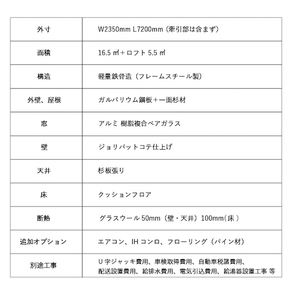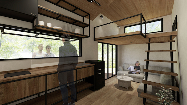 「自然の中の暮らしを実現するタイニーハウス」をコンセプトに開発した、ロフトスペースを含む約22平米のナンバー付きトレーラーハウス(車検取得可能)。外装・内装とも自然と調和するように木質感を持たせ、外と室内がシームレスにつながるキッチン・リビング、ラウンジスペースを設けた。宿泊施設、自宅、セカンドハウスとしての利用が考えられるとする。