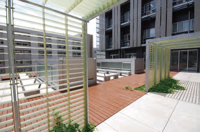 typeⅠは、高さ調整が可能な束材とパネル(TAKステージパネル)を組み合わせて二重床を構成し、段差を解消するシステム。既存の床面との間にできる空間は配管・配線スペースとして利用でき、既存防水層の保護にも役立つ。表面仕上げはタイル、玉砂利、石、メタル調などから選べる。パネルは1枚ごとに取り外せるため、点検も容易とする。