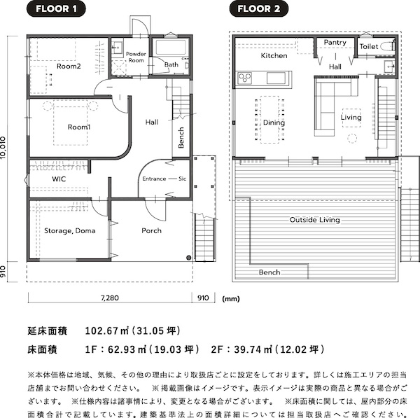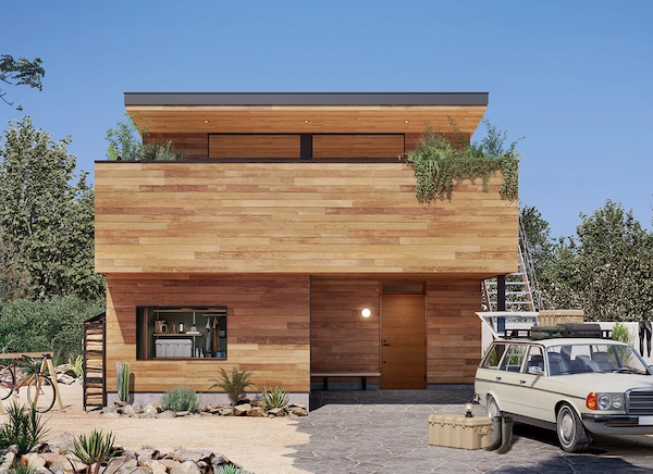 凹凸があるボックス型のフォルムと天然木外壁の外観、2Fのアウトサイドリビング、4mの大開口で外と中をシームレスにつなぐインサイドリビング、玄関ポーチからそのままアウトドアギアがしまえて趣味部屋としても使える土間仕様のストレージが特徴となっている。