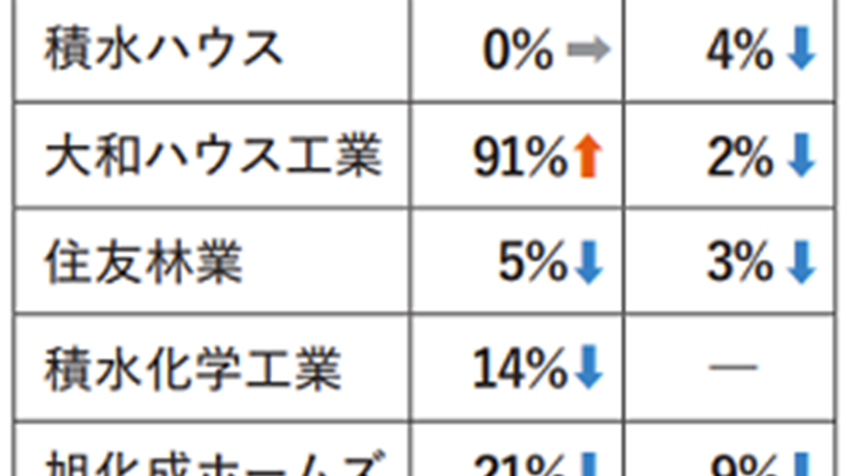 ハウスメーカー各社が5月20日までに発表した4月の戸建て注文住宅の受注速報値(対前年同月比、旭化成ホームズは集合も含む)は、12社中5社が3カ月以上連続で減少しており、うち2社は2ケタ減が続く。一方で、住友林業は3カ月連続で増加、4月は46%増、期累計では18%増となった。2022年10月から増加傾向が続いていた三井ホームは3月に16%減、4月は4%増と回復した。
