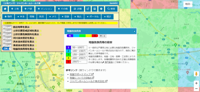 地図上がタイル状に色分けされ、そのエリアでの一般的な戸建用土地に必要な地盤改良費用を知ることができるようになった