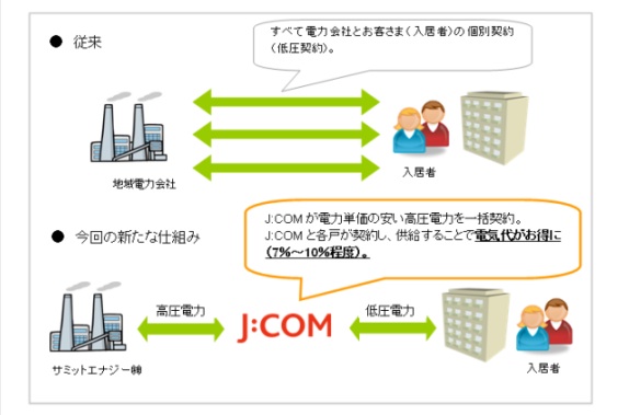 ケーブルテレビ最大手が、マンション向けのエネルギーサービスに乗り出す。ジュピターテレコム(=J:COM、東京都千代田区)は12月、住友商事グループの電力会社・サミットエナジー(東京都中央区)から電力供給を受け、都内のマンションを対象に割安な電力を提供する「マンション向け電力一括受電サービス」をスタートする。J:COMがマンション単位で電力の一括契約を結ぶことで、居住者は従来のように電力会社と個別契約するよりも7〜10%安く電力を利用できるメリットがある。