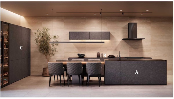 キャビネットの扉はプッシュオープン式とし、取っ手と継ぎ目の凹凸をなくすことで、家具のように洗練されたノイズレスデザインを目指した。扉柄には金属や石材の質感をリアルに再現した「ソリッドエレメント」3柄を設定している。