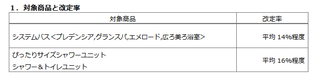タカラスタンダード(大阪市)は6月1日、システムバスやシャワーユニットの価格を、8月28日注文分から改定すると発表した。値上げ幅は14~16%程度。