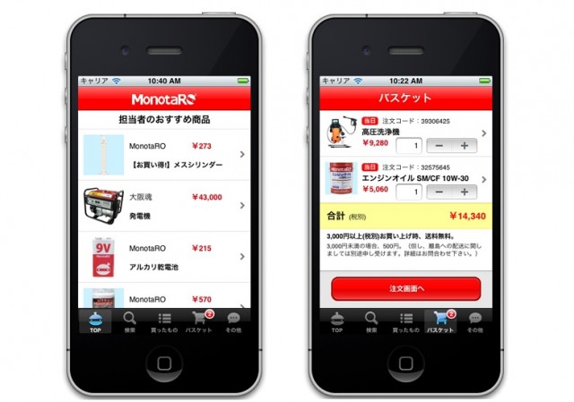200万点の取り扱いアイテムをほこる工業用間接資材の通販大手・MonotaRO(=モノタロウ、兵庫県尼崎市)は11月8日、スマートフォン用のショッピングアプリ「モノタロウバスケット」の導入をスタートした。最近はインターネットでの注文が全体の8割を占め、なかでもタブレット端末やスマートフォンからの利用が急激に伸びているという。7月度にはタブレット・スマートフォンからの売上げ額が前年同月比で4倍に増加したことから、スマートフォンでの買い物の利便性を向上するアプリを開発した。