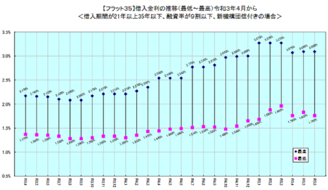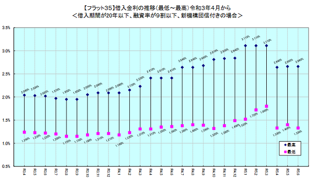 返済期間20年以下の「フラット20」の最低金利は、融資率9割以下が1.33%、9割超が1.47%で、前月から0.07ポイント下がり、2カ月ぶりに下降。最高金利は、9割以下が2.66%、9割超が2.80%だった。