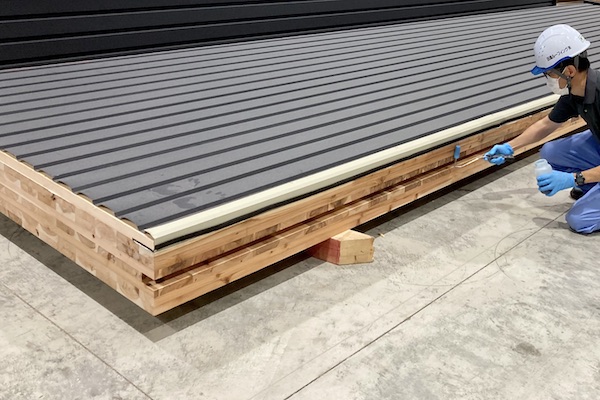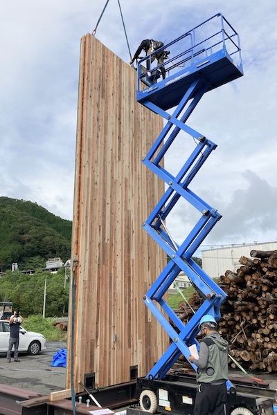 狭小地を想定し実大CLTパネルでプレセット外壁の防水性を検証(2022年9月岡山県真庭市にて)