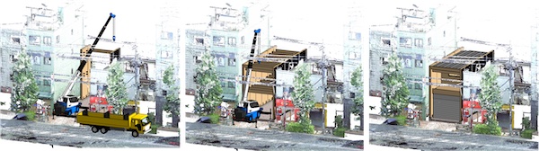 内外装をプレセットした大型CLTパネルの搬入および建て方を効率化するため、BIMを使った施工シミュレーションを繰り返し行った。前面道路の交通量や電線が多いため、あらかじめクレーンの配置やトラック搬入時間を決め、オリジナル治具も開発した。実際の建て方は道路の占有許可時間等の関係で7日間を要したが、事後検証の結果、最短4日間で建て方が完了する工法であることを確認した。