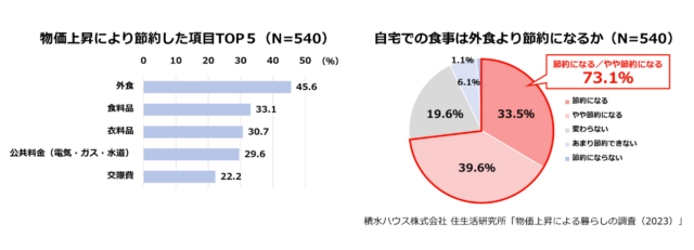 昨年(2022年)の夏と比較し、商品やサービス別に個人が感じる物価上昇幅について質問したところ、「公共料金(電気、ガス、水道)」で71.5%、「食料品」で54.6%が「20%以上の上昇を感じている」と回答。物価上昇により節約した項目について聞いたところ、「外食(45.6%)」が最も多く、次いで「食料品(33.1%)」、「衣料品(30.7%)」、「公共料金(29.6%)」という結果となった。特に比較的柔軟に対応しやすい食事に関する節約傾向が見受けられ、自宅での食事は外食と比較し、73.1%が「節約になる/やや節約になる」と回答した。