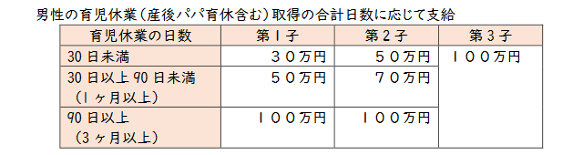 変更前は、第1子30万円、第2子50万円、第3子以降1人につき100万円を支給していたが、変更後は男性の育児休業取得日数が30日未満、90日未満、90日以上に分けて支給。90日以上取得した場合、第1子から100万円が支給される。育児休業は分割して2回取得も可能。
