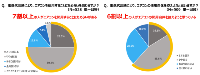厳しい暑さの中、節電のために無理にエアコンの使用を控えると、熱中症を引き起こすリスクも考えられる。しかし、大手電力7社の電気代高騰を受け、75.2%が「エアコンを使用することにためらいを感じる」と回答しており、さらに61.7%が「エアコンの使用自体を控えようと思っている」としていることもわかった。