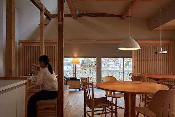 木造軸組パネル工法をベースに、LIXILの「まるごと断熱リフォーム」を利用して高気密・高断熱・ZEH化をはかった。旧家の柱や梁をできるだけ生かし、床・天井・建具には地元の木材を使っている。