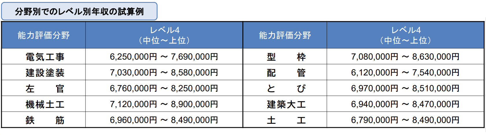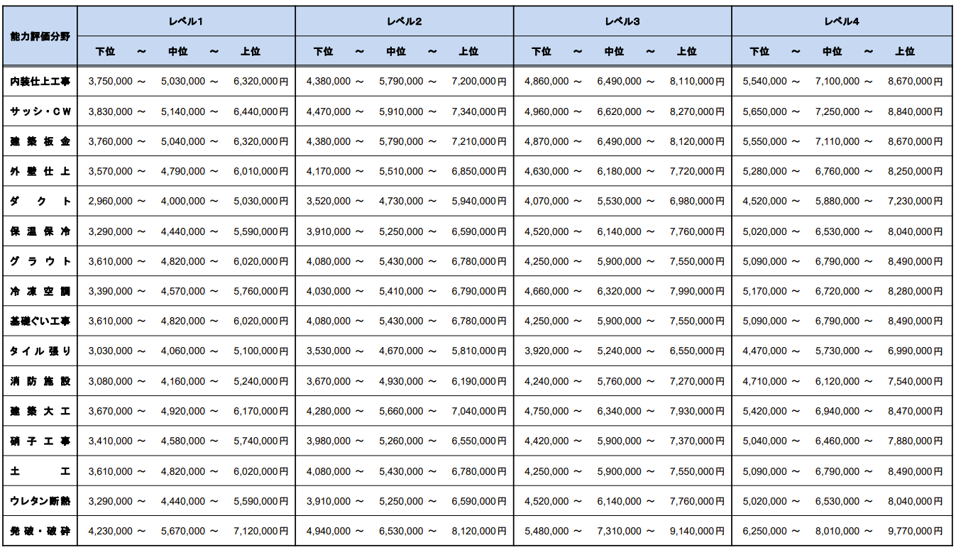 建築大工に関しては、▽レベル1=下位367万円、中位492万円、上位617万円、 ▽レベル2=下位428万円、中位566万円、上位704万円、▽レベル3=下位475万円、中位634万円、上位793万円、▽レベル4=下位542万円、中位694万円、上位847万円――となっている。