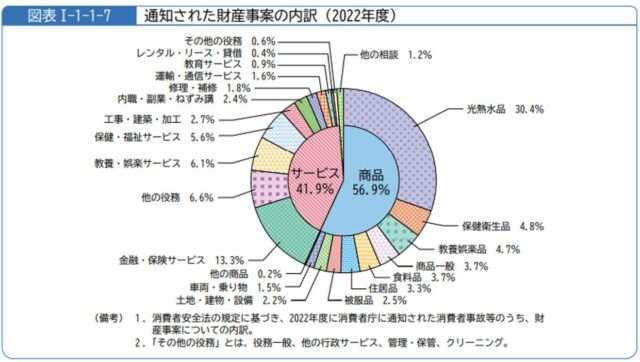 他に、全年齢を対象とした身体事故に関する調査では、重大事故1351件のうち「火災」が1141件(84.5%)で多数を占めた。特に生活家電、住宅用蓄電池、給湯ボイラーなどの住宅設備からの出火が火災につながった例が目立っている。また、財産事案では「商品」が5915件(56.9%)で最も多く、そのうち電気・ガス・水道などの設備・器具を含む「光熱水品」が30.4%で多かった。