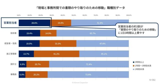 職種別に見ると、28.6%の営業担当者が「現場と事務所間での書類のやり取りのための移動」に3時間以上費やしていると回答。紙が原因で無駄な移動時間が発生している実態が明らかになった。