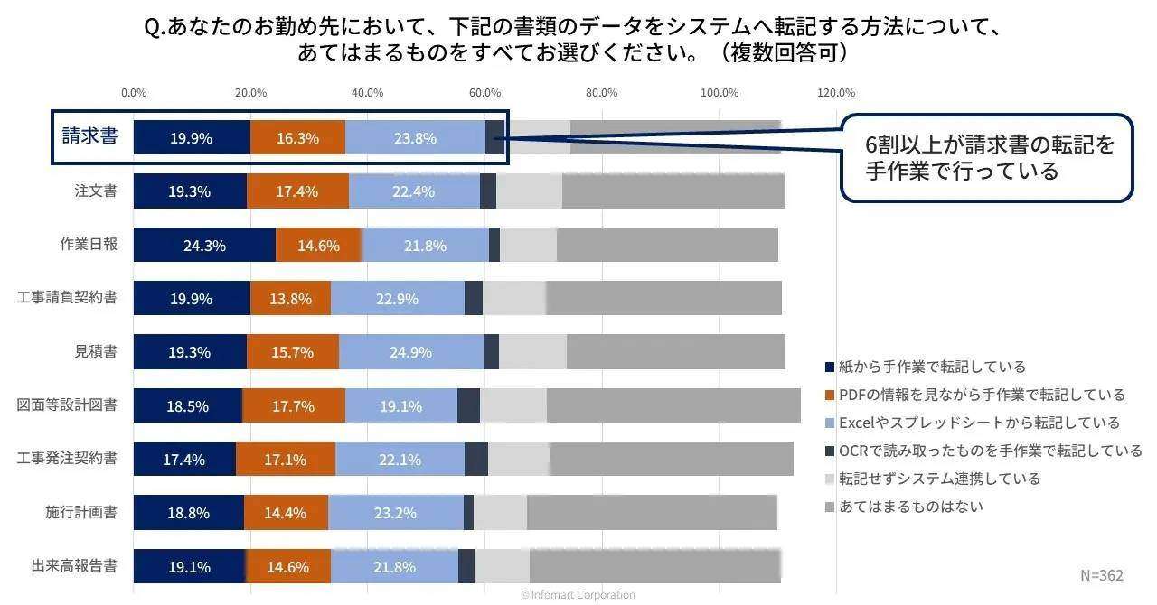 インフォマート(東京都港区)が建設業従事者を対象に、バックオフィス業務など日々の業務に関する調査を実施したところ、約4割が請求書の受け渡しを紙で行い、6割を超える企業が手作業で請求書を転記していることがわかった。紙文化が根強く残る建設業界の現状が浮き彫りとなった。