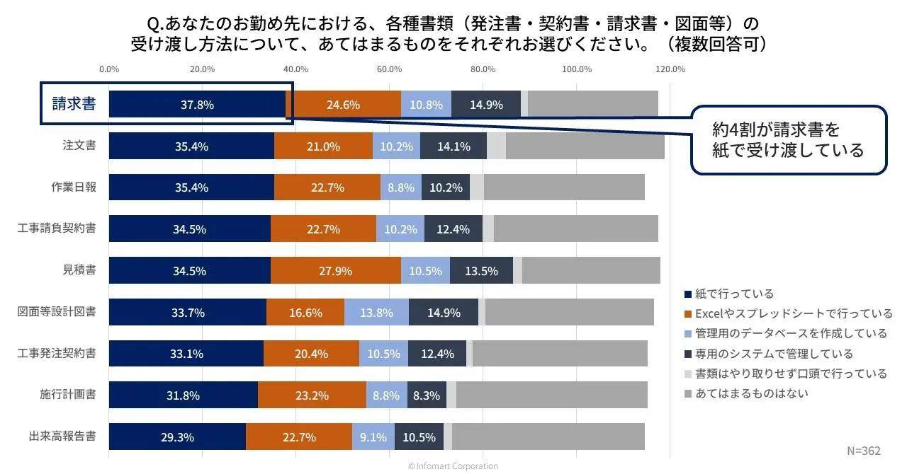 各種書類(発注書・契約書・請求書・図面等)の受け渡し方法は、「紙で行っている」と回答した割合が約3割で最多となった。次いで、「Excelやスプレッドシートで行っている」が約2割。特に、請求書に関しては37.8%が「紙で行っている」と回答し、全ての書類の中でトップになった。
