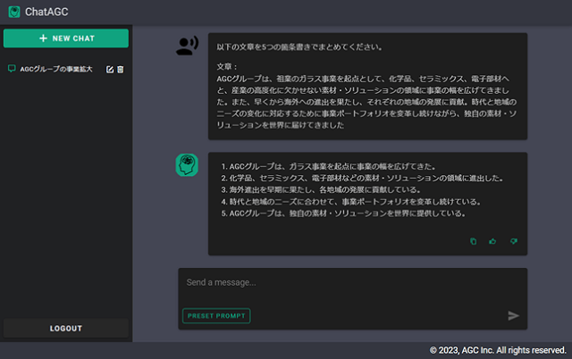 AGC(東京都千代田区)は6月19日、社内向け対話型AI「ChatAGC」を構築し、6月から本格運用を開始したと発表した。