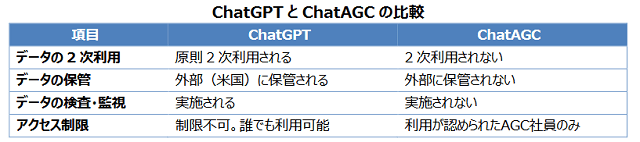 「ChatAGC」は、従業員が安心・安全にチャットAIを業務に活用することを目的に、Microsoft社のAzure OpenAI Serviceを用いて開発。ChatGPTと同等の対話機能を持ちながら、入力情報が社外組織など外部に送信されることなく、同社社員のみが利用できる。データは同社ネットワークに保管され、2次利用されない。