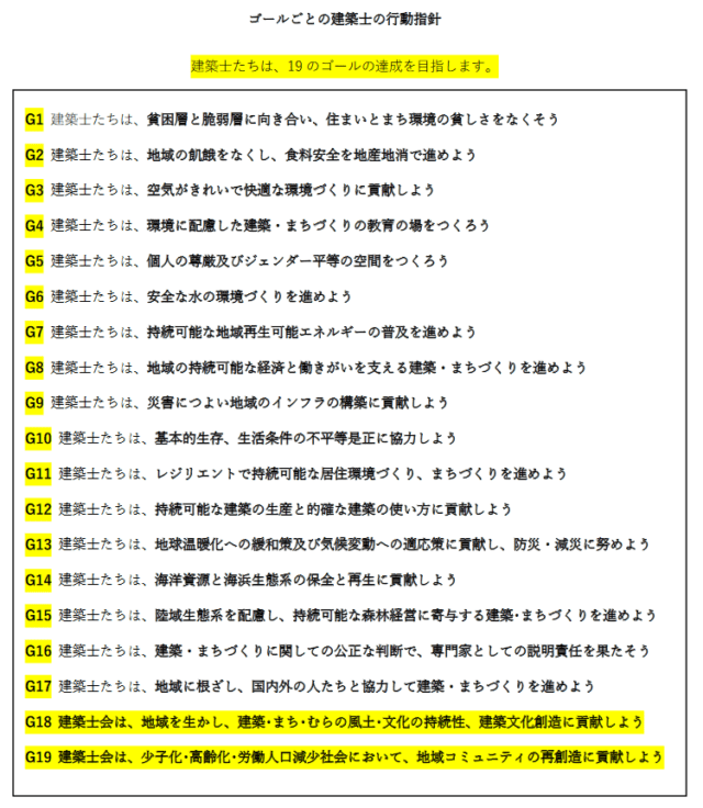 19のゴール(G)のうちG1~17は、SDGsの17のゴールに紐づくもの。残り2項目は「G18 建築士会は、地域を生かし、建築・まち・むらの風土・文化の持続性、建築文化創造に貢献しよう」と「G19 建築士会は、少子化・高齢化・労働人口減少社会において、地域コミュニティの再創造に貢献しよう」。G18、19は「建築士会」を主語とし、地域文化の保護・育成や少子高齢化など大きな課題に、団体として取り組む姿勢を表明している。