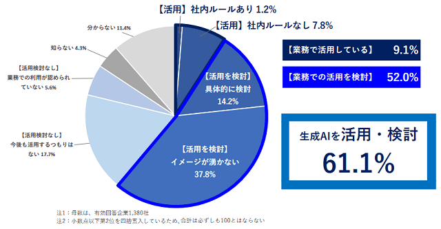 帝国データバンク(東京都港区)は6月20日、生成AI(人工知能)の活用に関する企業アンケートの結果を発表した。有効回答企業数は1380社。近年、オープンAI社の「Chat(チャット)GPT」など、生成AIを活用したビジネスに注目が集まっていることから同調査を実施。生成AIを業務で「活用(9.1%)」「検討(52.0%)」している企業は、あわせて61.1%になることがわかった。活用にあたり社内ルールを設けているのは1.2%、ルールがないまま活用している企業は7.8%だった。