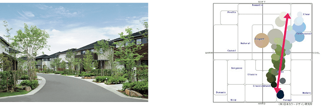 エクステリア提案においても、従来のテイスト提案から、まちなみや緑との調和を重視した提案に変えた。日本カラーデザイン研究所と共同で国内外の美しいまちなみを構成する色や植栽の色を分析し、日本の景観や樹木と調和する色を外壁色のラインナップに反映した。また、美しい景観に共通する色の法則「明度グラデーション」に着目し、1棟の外観やまちなみで、上品でやさしいグラデーションを実現する提案を行う。経年による暮らしの変化に対応するプランニングや、自然を取り込んだ提案なども強化し、愛着の持てる住まいや空間を提供していく。