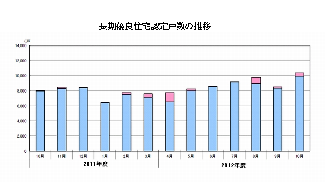 国土交通省が11月15日発表した2012年10月の長期優良住宅認定戸数は戸建て住宅が9943戸、共同住宅などが450戸で、合計1万0393戸だった。前年同月に比べ28.9%増。2011年8月以来14カ月ぶりに1万戸を超えた。