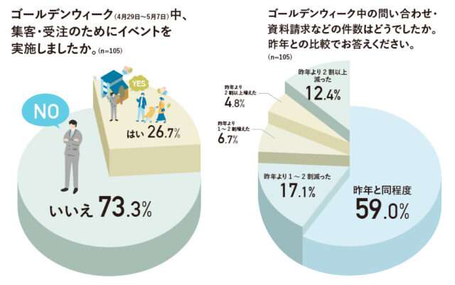 年の大型連休(ゴールデンウィーク、4月29日~5月7日)は、昨年に引き続き行動制限がなく、コロナの5類移行を目前に控えていたこともあってか、各地の行楽地などが大きな賑わいを見せた。工務店も集客に動くかと思いきや、イベント等を実施したのは約4分の1にとどまった。世の中に合わせて、連休中は休業する工務店も少なくない。また、旅行やレジャー、帰省に人が流れるのを懸念したのか「集客が期待できなかったから」実施しなかったという声も多い。