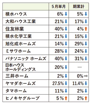 ハウスメーカー各社が6月20日までに発表した5月の戸建て注文住宅の受注速報値(対前年同月比、旭化成ホームズは集合も含む)は、12社中11社が減少、うち9社は2ケタ減が続いた。また、3カ月以上連続して減少したのは6社(積水ハウス、積水化学工業、旭化成ホームズ、ミサワホーム、日本ハウスHD、タマホーム)となった。