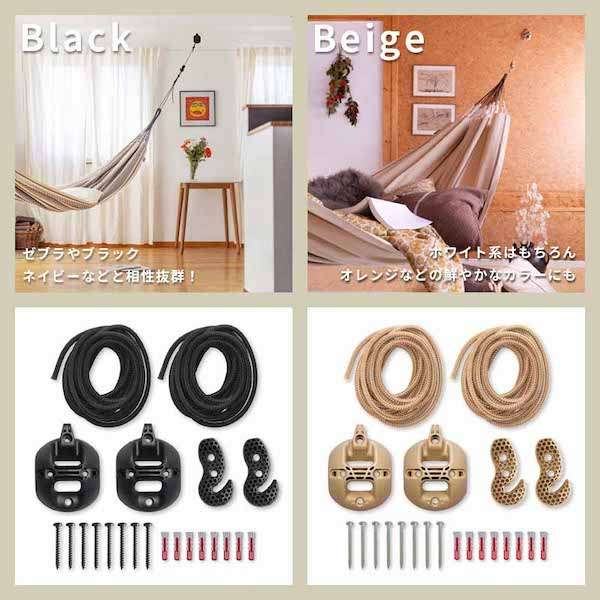 2点吊りのハンモックと1点吊りのハンモックチェアの専用取り付け具はこれまでブラック1色展開だったが、「ナチュラルカラーに合う取り付け具がほしい」との声を受けて、新たにベージュを追加した。
