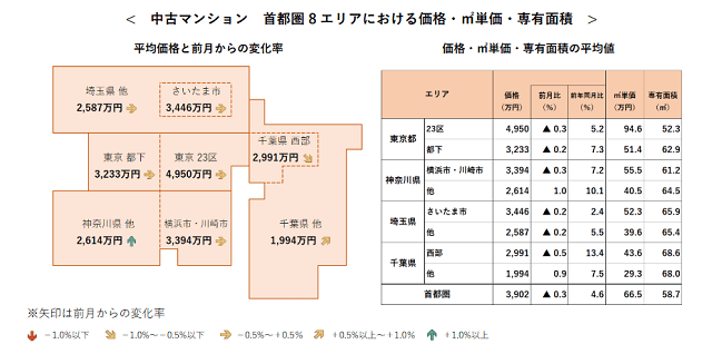 首都圏全体の1戸あたりの平均価格は3902万円で、前月比0.3%下落。神奈川県他、千葉県他を除く6エリアで前月比マイナスとなり、価格上昇の勢いが弱まっている。一方、全エリアで23カ月連続前年同月超えとなった。