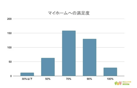 「マイホームへの満足度」について聞いたところ、1位が「70%(159人)」、2位が「90%(130人)」、3位が「50%(63人)」という結果に。70%以上の満足度の人が全体の8割以上おり、多くの人がマイホームに満足していることがわかった。