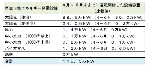 経済産業省が11月16日発表した、今年4~10月の再生可能エネルギー発電設備の導入量(速報値)は、115.5万kWだった。9月末時点から24.3万kW増えた。太陽光発電設備が112.6万kW(前月比24.1万kW増)。9割以上を占めている。そのうち、住宅用は88.6万kW。