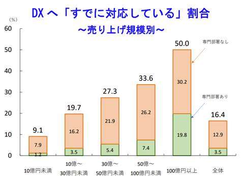 「すでに対応している」企業の割合を売り上げ規模別にみると、売上高が「100億円以上」では50.0%と半数にのぼった。以下、「50億~100億円未満」が33.6%、「30億~50億円未満」が27.3%、「10億~30億円未満」が19.7%、「10億円未満」が9.1%と続き、売り上げ規模が小さくなるほどDXへの取り組みが進んでいない。「100億円以上」の企業で専門部署を置いているのは19.8%で、他の売り上げ規模と比較して10ポイント以上高かった。