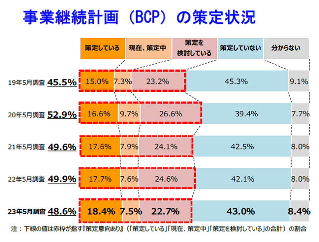 BCPについて『策定意向あり』とする企業は、新型コロナウイルスの感染が拡大し始めた2020年をピークに低下している。同社は、感染拡大へのリスクが表面化したことで一時的に取り組み意識が高まったが、ポストコロナに向けて経済活動が加速するなか、BCP策定への優先順位が下がる傾向にあると指摘。BCPの準備不足による経済活動へのマイナスの影響が大きいことから、企業、行政が連携して対策する必要があるとしている。