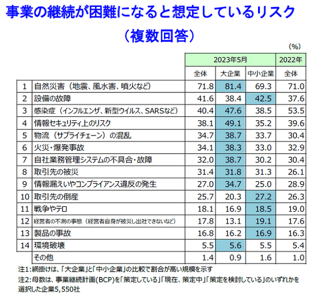 BCP策定の意向がある企業に対して、事業の継続が困難になると想定しているリスクを聞いたところ、地震や風水害、噴火などの「自然災害」が71.8%と最も高くなった。次に「設備の故障」(41.6%)が続いた。インフルエンザ、新型ウイルス、SARSなど「感染症」(40.4%)は前年から13.1ポイント低下した。また、各地で震度5弱以上の地震が発生していることから、「取引先の被災」(31.4%、5.3ポイント増)、「物流(サプライチェーン)の混乱」(34.7%、4.3ポイント増)が上昇している。事業中断リスクに備えて実施・検討していることは、「従業員の安否確認手段の整備」(68.2%)、「情報システムのバックアップ」(57.1%)、「緊急時の指揮・命令系統の構築」(41.0%)が多かった。