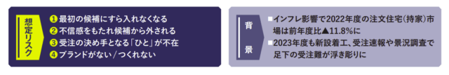 技術力、特に商品開発力が弱く、集客・営業や紹介の仕組み・工夫がない工務店はすでに受注が厳しく、今後は一層受注難に陥ることになる。
