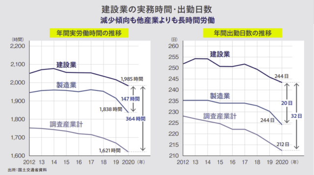 建設業の労働時間·出勤日はまだ多い