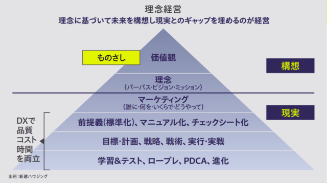 [上図]は「理念経営」の概念図だ。経営者の価値観に基づいて理念=ビジョン(実現したい未来・理想)、ミッション(そのために行うこと)、パーパス(なぜ行うのかの理由)を明確化する。