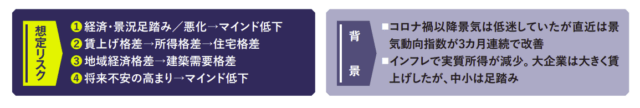 経済・景気の悪化は住宅取得意欲(マインド)を押し下げ、受注難と住宅予算の低下につながるため、外部環境の変化を受けにくい工務店にとっても一定のリスクとなる。