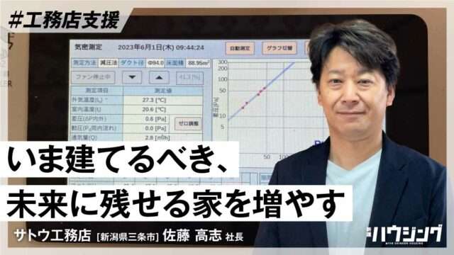 他社に対する技術コンサルティングや気密測定、構造計算を“副業”的に行っているのがサトウ工務店(新潟県三条市)だ。新築ほど額は大きくないが安定した収入源にもなるうえ、他社の技術・品質向上を支援することによって社会的な自社の役割を明確化し、厳しい市場でも求められ続ける工務店であり続けようとしている。