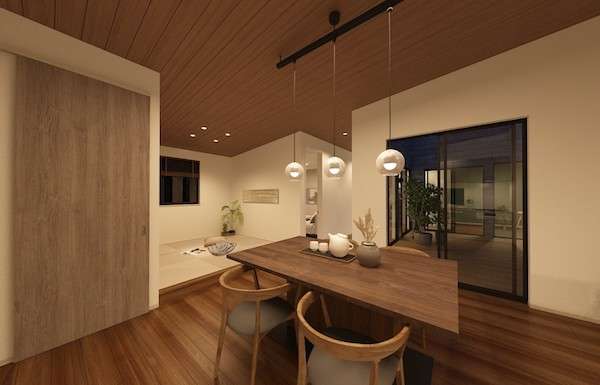 約7mの大開口で室内と中庭をシームレスにつなぎ、中庭の周囲は絵を飾ったり棚を置ける広縁とした。LDKに面した和室スペースは暮らしに合わせて客間、洋室、ペット室、ストックルームなどとしてカスタマイズできるとする。