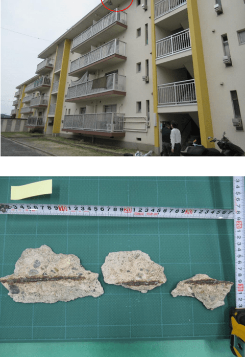 コンクリート片落下事故があった県営住宅総社泉団地2号棟北面(上)とコンクリート片(下)